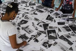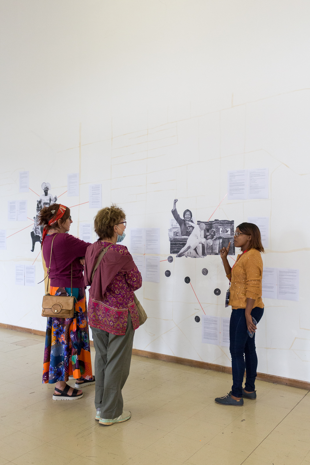 Karoo Kaarte team gathers for the research and creative process used to bring together a range of participants to reimagine the archive as an inclusive community resource. And images and details of the Karoo Kaarte team engaging, over a series of workshops, with Zietske Saaiman’s large-scale map of Oudtshoorn and its many suburbs which she painstakingly demarcated in masking tape on the floor of the CP Nel Museum Hall. Photography by Ryan Dammert and Karoo Kaarte.