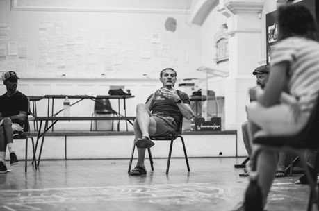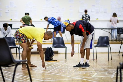 Co-Facilitator Vaughn Sadie leading a discussion with the core team (left) with co-facilitator Neil Coppen during rehearsals for Op Hierie Dag. Photography by Ryan Dammert.