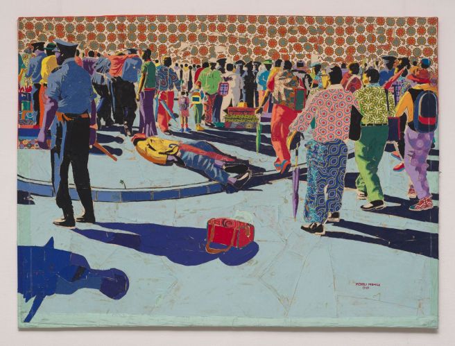 The brightly coloured collage is a snapshot of an ominous moment in a protest wherein a person is lying lifeless on the ground, yet no one seems alarmed. And therein lies the tale.
